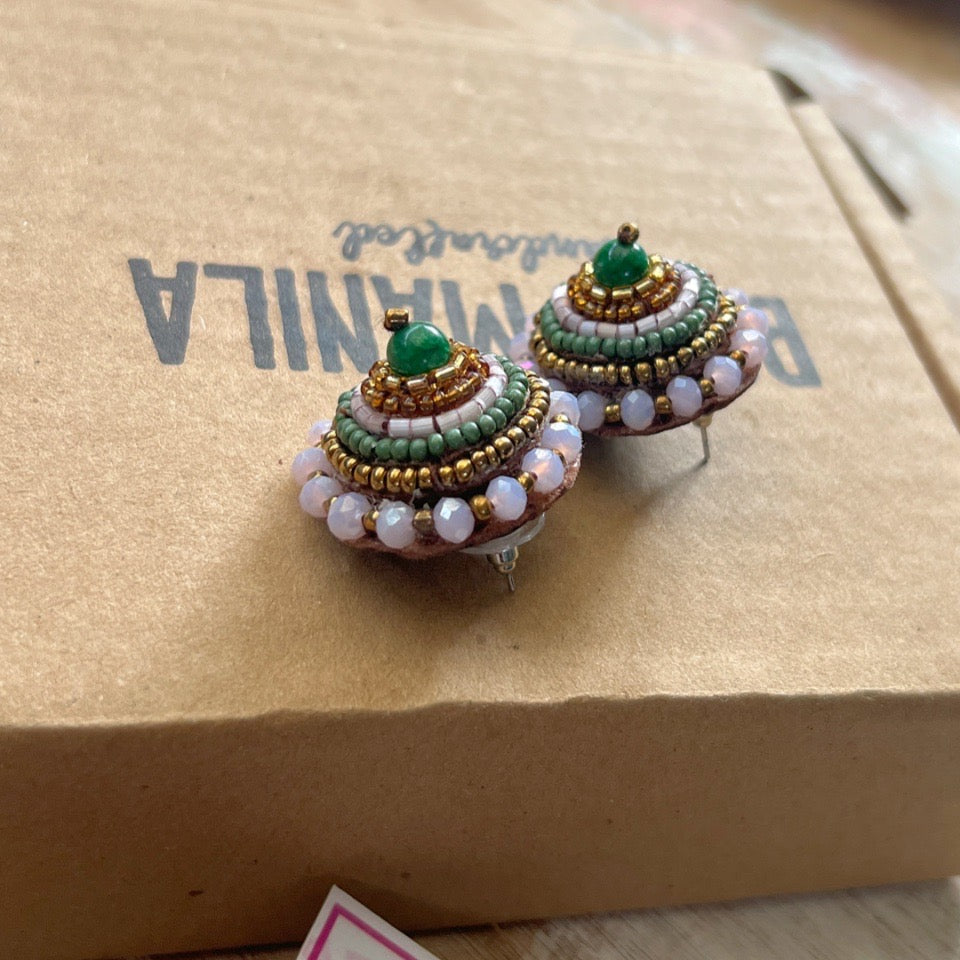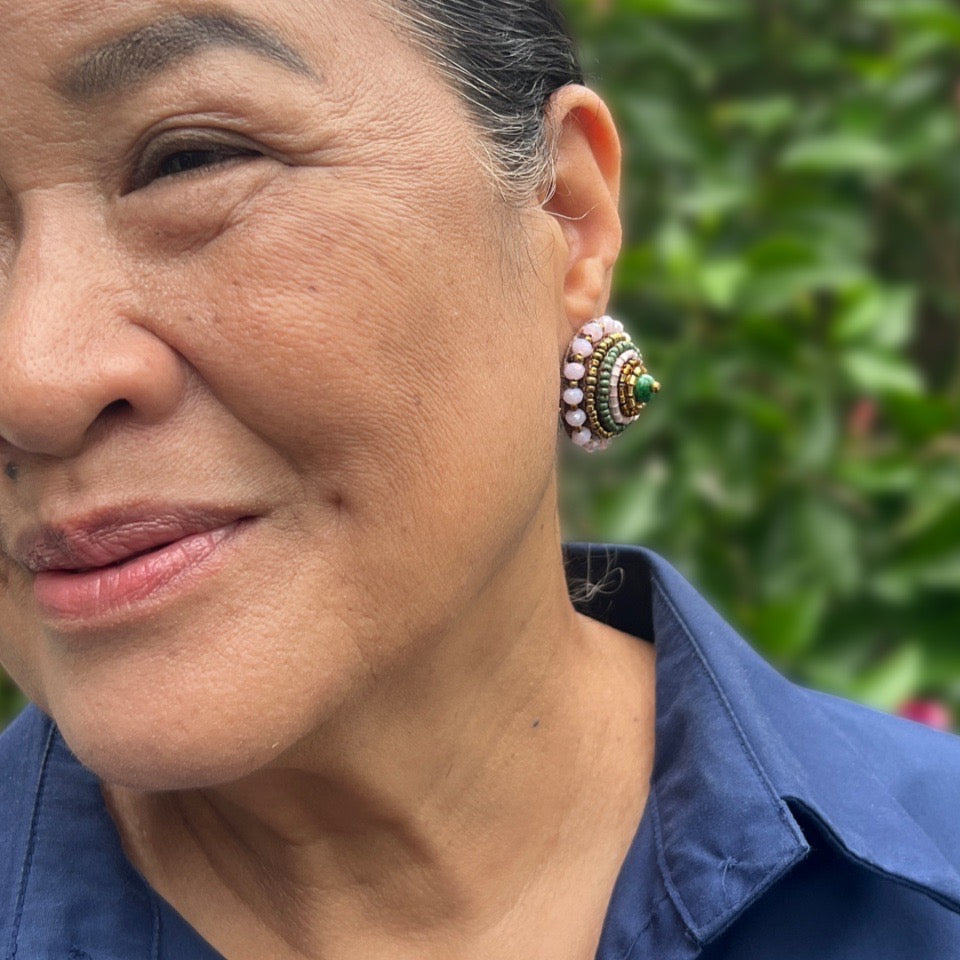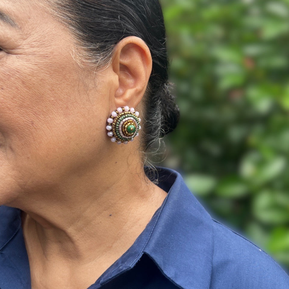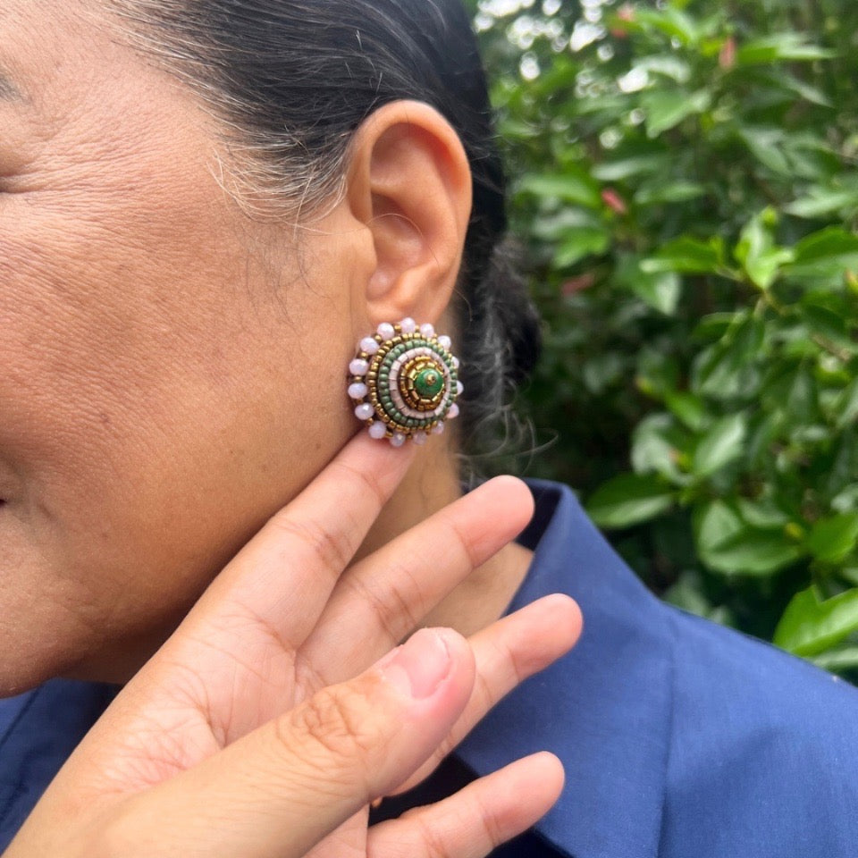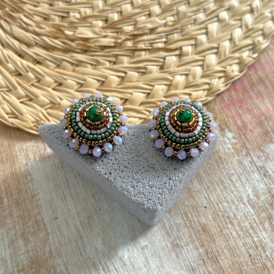 • Made with Jade stone, seed beads, Austrian crystals, glass. Backing is vegan suede. Worn with 12mm stainless steel posts and secured wide silicone stoppers to support your lobes. Nickel free.