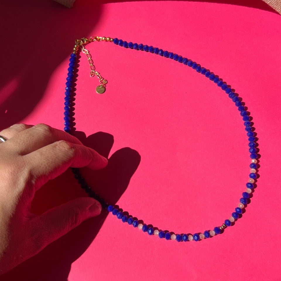 Is a long necklace of deep blue beads and peachy-white crystals, like midnight meeting the first hint of morning light. Each faceted stone catches the sun in tiny flashes, soft and luminous, while sparkly details warm the piece with quiet elegance. Made for the woman who carries both depth and softness, steady as the night, glowing as she moves through it.